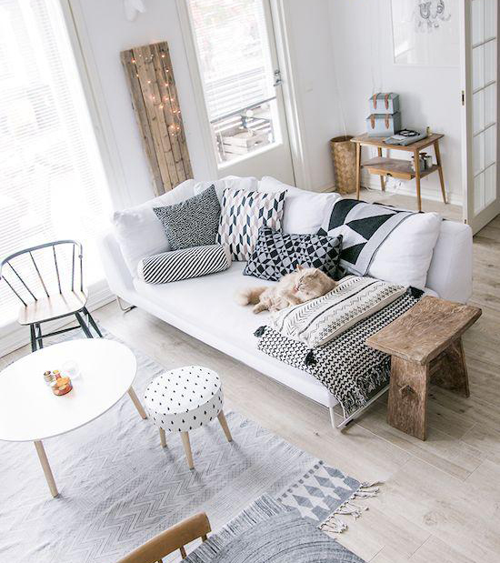 小空间面积不大,抛开传统的1+2+3组合沙发,直接放一张三人位沙发,搭配1-2个蒲团坐墩,圆形的小茶几不仅让整理空间看起来更宽敞,而且活泼生动了许多。